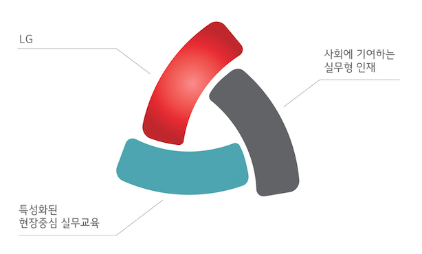 • 삼각형 형태의 세가지 요소와 색상은 각각 LG, 특성화된 현장중심의 실무교육, 사회에 기여하는 실무형 인재를 의미합니다.