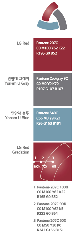 • LG Red 그라데이션은 무한하게 변화되는 세계로의 대응을 Yonam U Gray는 세계로 나아가는 연암공과대학교의 젊은 인재들을 Yonam U Blue는 현장중심의 실무교육을 담았습니다.
